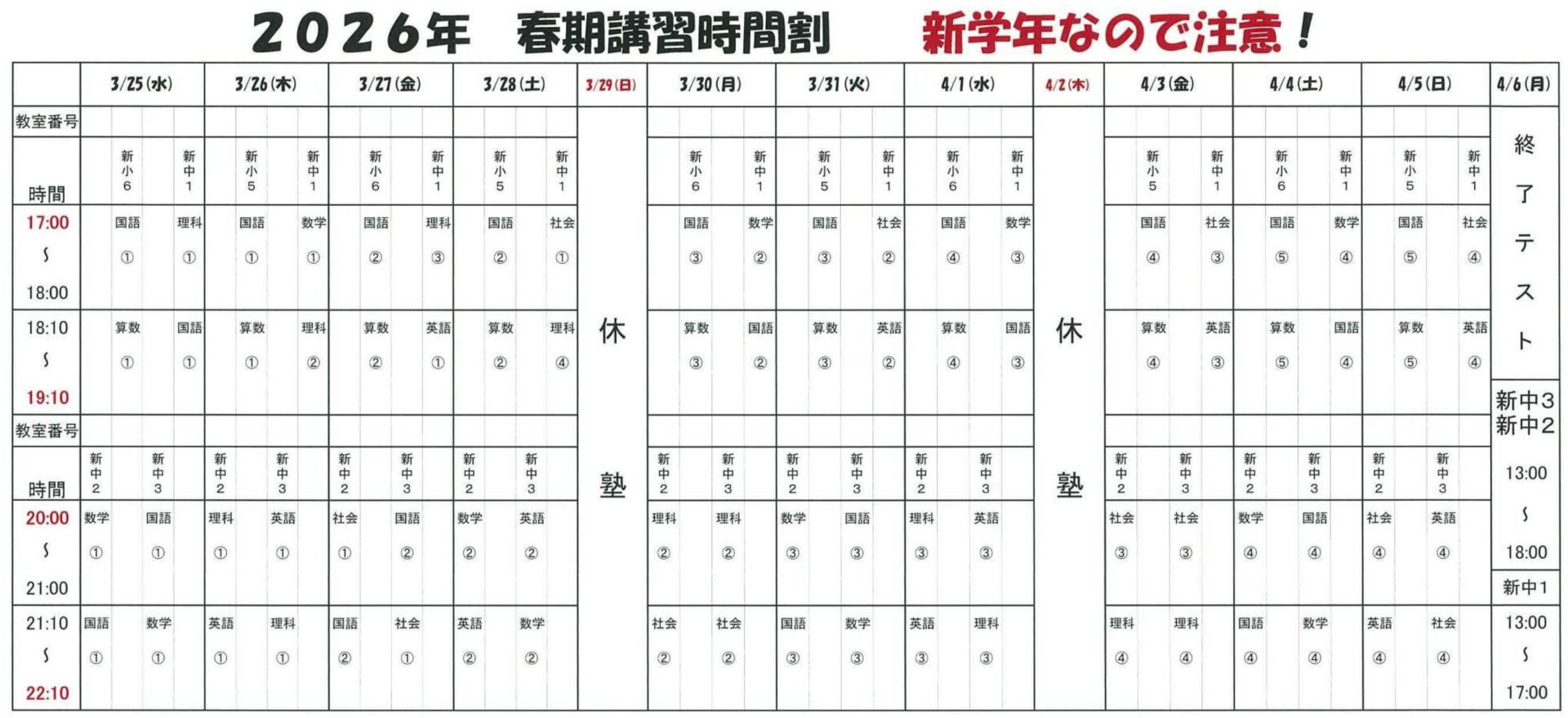 春期講習スケジュール